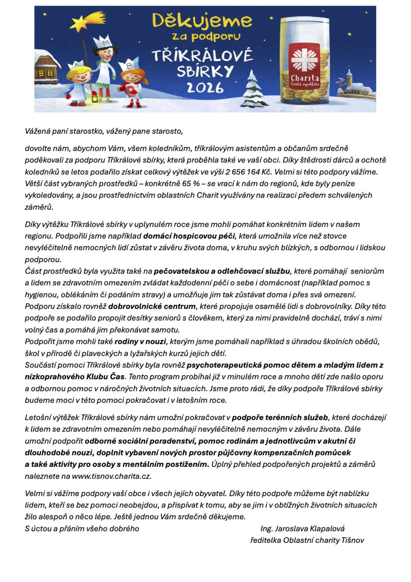 Dovolte nám, abychom Vám, všem koledníkům, tříkrálovým asistentům a občanům srdečně poděkovali za podporu Tříkrálové sbírky, která proběhla také ve vaší obci. Díky štědrosti dárců a ochotě koledníků se letos podařilo získat celkový výtěžek ve výši 2 656 164 Kč. Velmi si této podpory vážíme. Větší část vybraných prostředků – konkrétně 65 % – se vrací k nám do regionů, kde byly peníze vykoledovány, a jsou prostřednictvím oblastních Charit využívány na realizaci předem schválených záměrů.