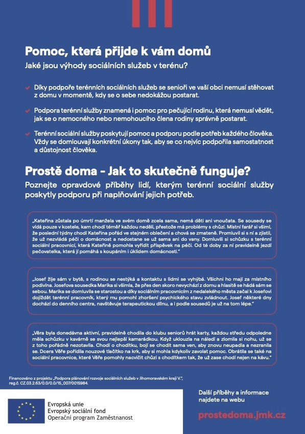Díky sociálním službám poskytovaným přímo v terénu mohou vaši blízcí i nadále žít ve svém přirozeném sociálním prostředí a udržovat vztahy, které jsou pro ně důležité – tedy mohou získat veškerou potřebnou péči prostě doma.