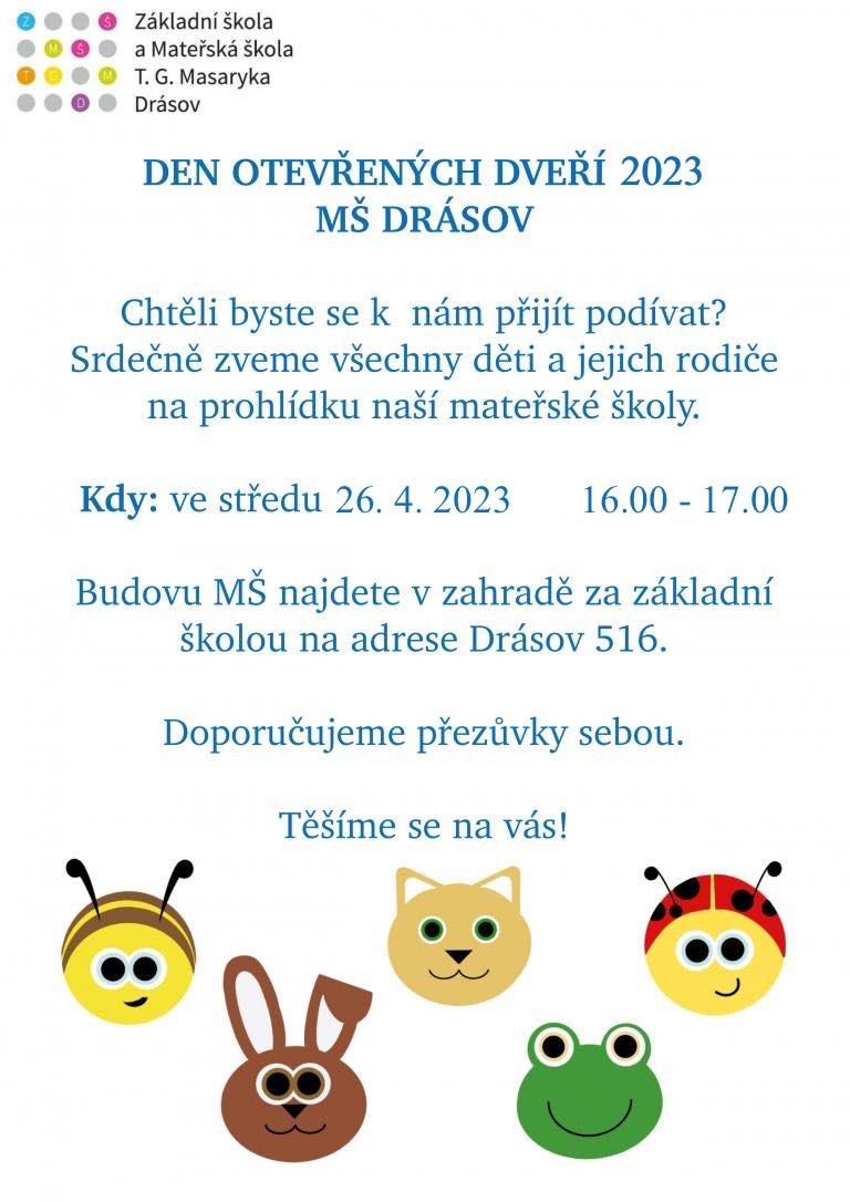 Den otevřených dveří MŠ Drásov 26. 4. 2023 Chtěli byste se přijít podívat do drásovské Mateřské školy? Na prohlídku jsou srdečně zváni všechny děti a jejich rodiče, a to ve středu 26. 4. 2023 od 16 do 17 hodin.Budovu MŠ najdete v zahradě za Základní školou na adrese Drásov 516.Doporučujeme přezůvky s sebou.