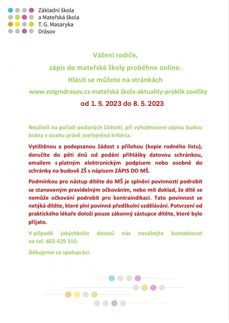 Zápis do Mateřské školy Drásov 1. 5. - 8. 5. 2023 Zápis do drásovské mateřské školy probíhá online ve dnech 1. až 8. května 2023 na této stránce.Kritéria pro přijímací řízení dětí do mateřské školy pro školní rok 2023/2024 naleznete zde.