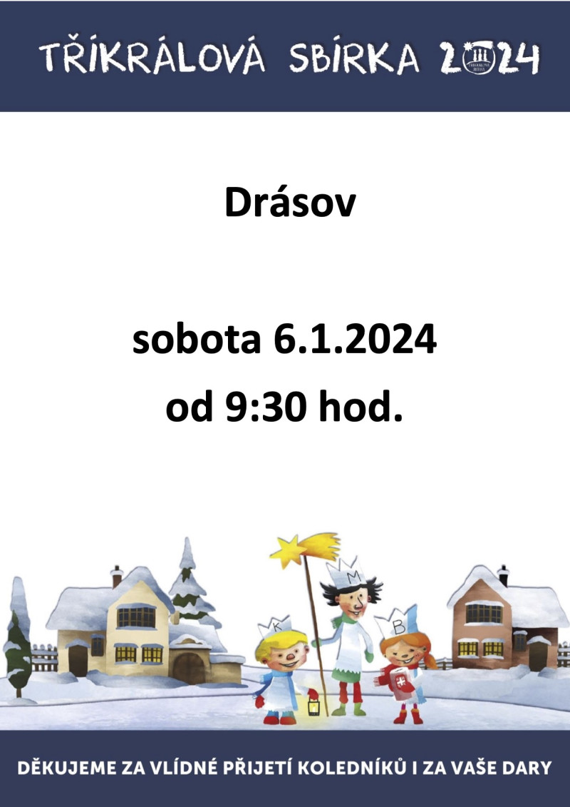 Tříkrálová sbírka 2024 - 6. 1. 2024 Charita Česká republika pořádá Tříkrálovou sbírku, která v Drásově proběhne v sobotu 6. 1. 2024 od 9:30 hod. Děkujeme za vlídné přijetí koledníků i za vaše dary.