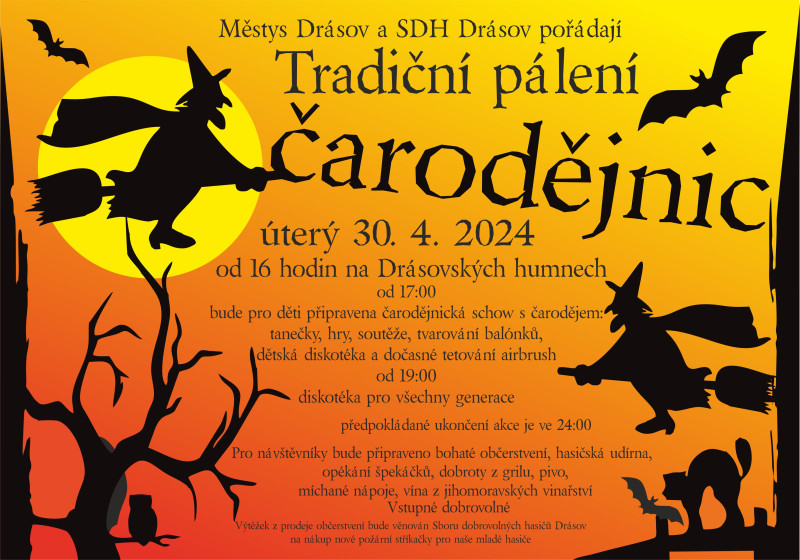 - od 17:00 bude pro děti připravena čarodějnická show s čarodějem: tanečky, hry, soutěže, tvarování balonků, dětská diskotéka a dočasné tetování airbrush