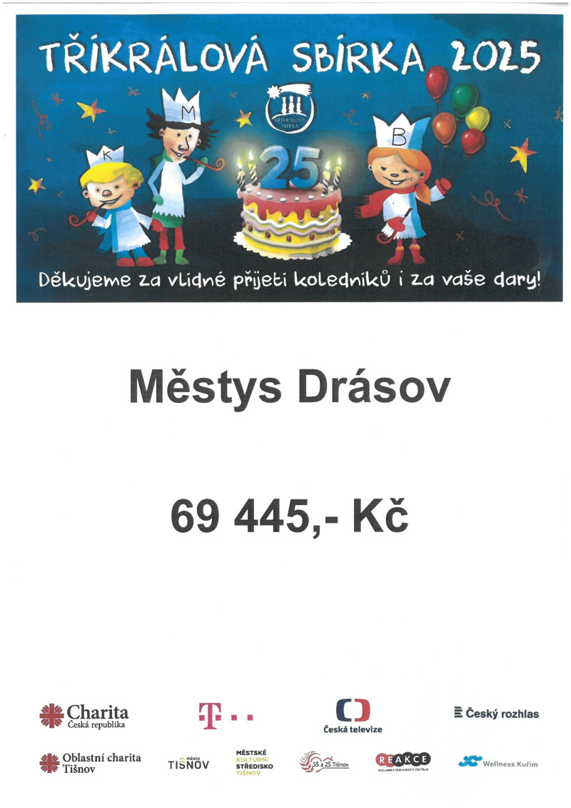 Tříkrálová sbírka 2025 - vybráno 69 445 Kč V rámci Tříkrálové sbírky se na území městyse Drásov vybralo celkem 69 445 Kč. Děkujeme!