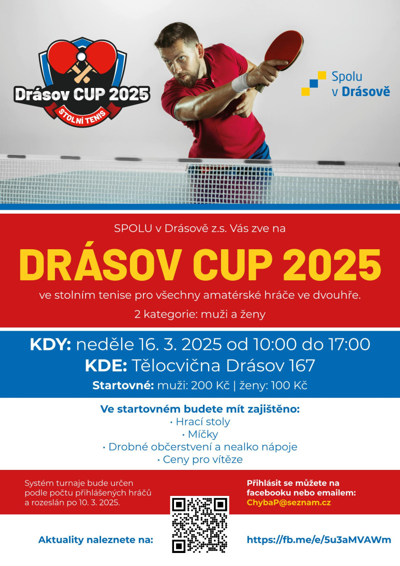 ve stolním tenise pro všechny amatérské hráče ve dvouhře v neděli 16. 3. 2025 od 10 do 17 v tělocvičně Drásov 167